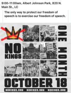 On October 18, millions of us are rising again to show the world: America has no kings, and the power belongs to the people. Join Indivisible Las Cruces at Albert Johnson Park between 9am and 12pm.